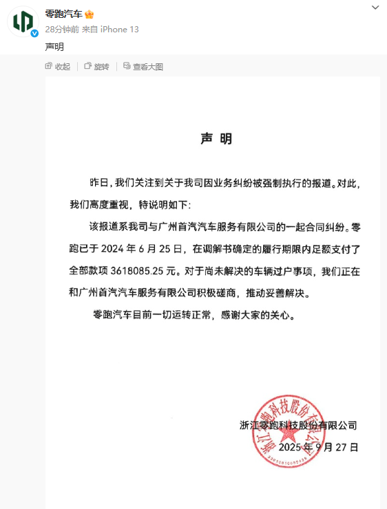 9月27日,零跑汽车就“被列为失信被执行人”一事发布声明回应。